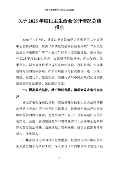 / 【七哥公文】2026年:关于2025年度民主生活会召开情况总结报告+更多免费公文+VX:QiGeGongWen2024