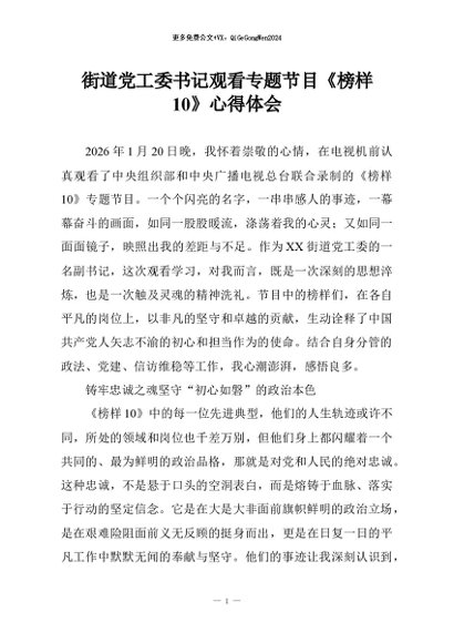 【七哥公文】2026年:街道党工委书记观看专题节目《榜样10》心得体会+更多免费公文+VX:QiGeGongWen2024