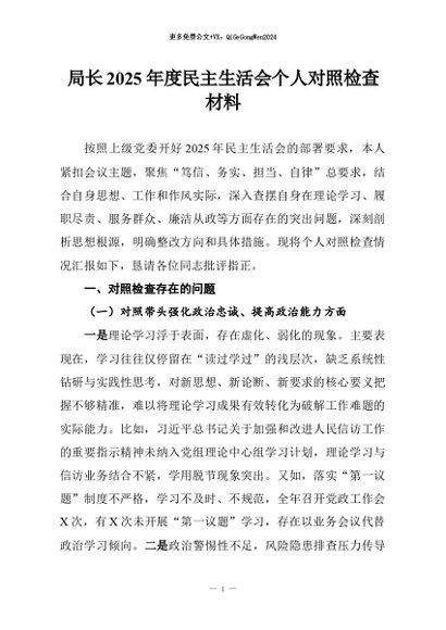/ 【七哥公文】2026年:局长2025年度民主生活会个人对照检查材料+更多免费公文+VX:QiGeGongWen2024