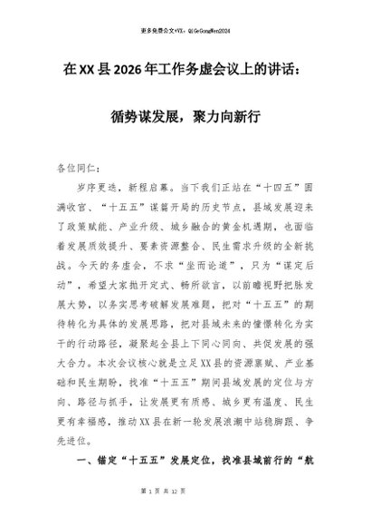 【七哥公文】2026年:在XX县2026年工作务虚会议上的讲话:循势谋发展,聚力向新行+更多免费公文+VX:QiGeGongWen2024