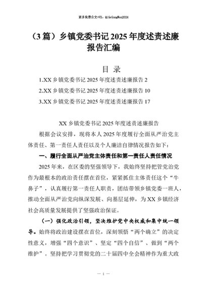 【七哥公文】2026年:(3篇)乡镇党委书记2025年度述责述廉报告汇编+更多免费公文+VX:QiGeGongWen2024