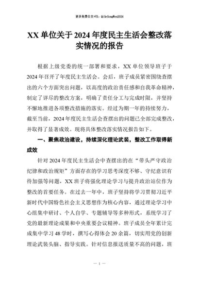 【七哥公文】2026年:XX单位关于2024年度民主生活会整改落实情况的报告+更多免费公文+VX:QiGeGongWen2024