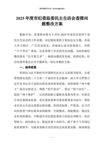 【七哥公文】2026年:2025年度市纪委监委民主生活会查摆问题整改方案+更多免费公文+VX:QiGeGongWen2024