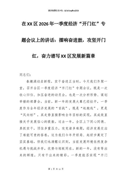 【七哥公文】2026年:在XX区2026年一季度经济“开门红”专题会议上的讲话:擂响奋进鼓,攻坚开门红,奋力谱写XX区发展新篇章+更多免费公文+VX:QiGeGongWen2024