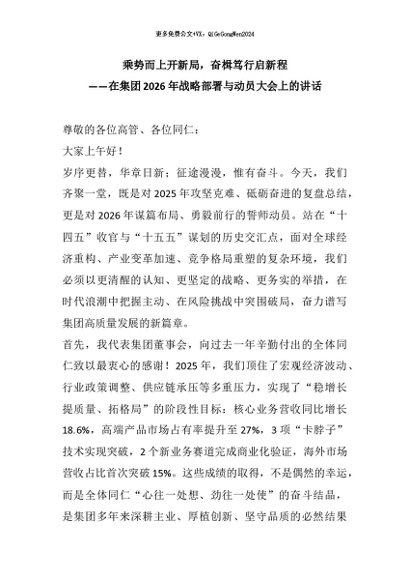 【七哥公文】2026年:乘势而上开新局,奋楫笃行启新程——在集团2026年战略部署与动员大会上的讲话+更多免费公文+VX:QiGeGongWen2024