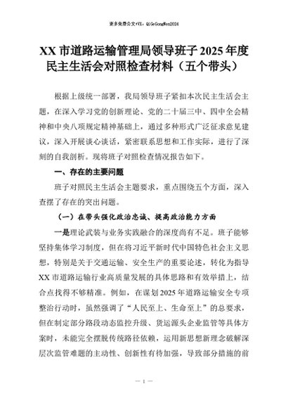 【七哥公文】2026年:XX市道路运输管理局领导班子2025年度民主生活会对照检查材料(五个带头)+更多免费公文+VX:QiGeGongWen2024 - 七哥-AI智库