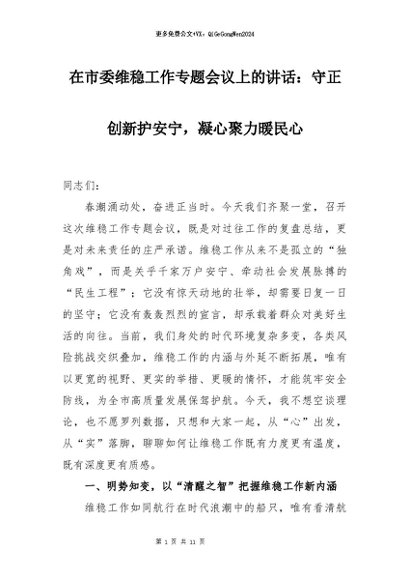 【七哥公文】2026年:在市委维稳工作专题会议上的讲话:守正创新护安宁,凝心聚力暖民心+更多免费公文+VX:QiGeGongWen2024