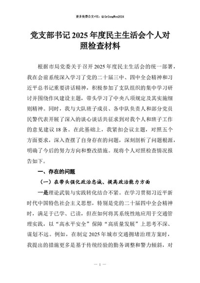 【七哥公文】2026年:党支部书记2025年度民主生活会个人对照检查材料+更多免费公文+VX:QiGeGongWen2024