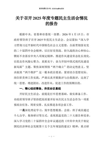 / 【七哥公文】2026年:关于召开2025年度专题民主生活会情况的报告+更多免费公文+VX:QiGeGongWen2024