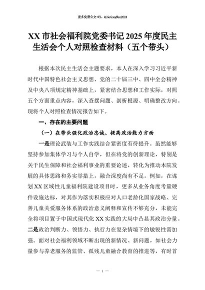 【七哥公文】2026年:XX市社会福利院党委书记2025年度民主生活会个人对照检查材料(五个带头)+更多免费公文+VX:QiGeGongWen2024