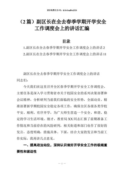 【七哥公文】2026年:(2篇)副区长在全去春季学期开学安全工作调度会上的讲话汇编+更多免费公文+VX:QiGeGongWen2024