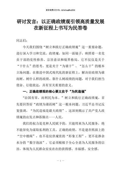 【七哥公文】2026年:研讨发言:以正确政绩观引领高质量发展在新征程上书写为民答卷+更多免费公文+VX:QiGeGongWen2024