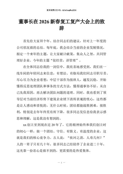 / 【七哥公文】2026年:董事长在2026新春复工复产大会上的致辞+更多免费公文+VX:QiGeGongWen2024