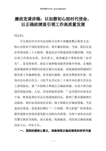 【七哥公文】2026年:廉政党课讲稿:以如磐初心担时代使命,以正确政绩观引领工作高质量发展+更多免费公文+VX:QiGeGongWen2024