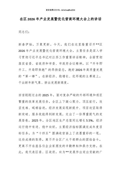 【七哥公文】2026年:在区2026年产业发展暨优化营商环境大会上的讲话_副本+更多免费公文+VX:QiGeGongWen2024
