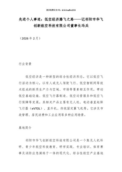 【七哥公文】2026年:先进个人事迹:低空经济腾飞之路——记祁阳市华飞创新航空科技有限公司董事长冯兵_副本+更多免费公文+VX:QiGeGongWen2024