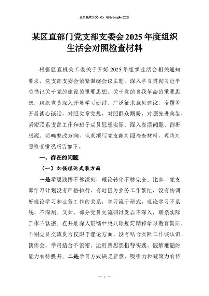 【七哥公文】2026年:某区直部门党支部支委会2025年度组织生活会对照检查材料+更多免费公文+VX:QiGeGongWen2024
