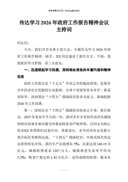 / 【七哥公文】2026年:传达学习2026年政府工作报告精神会议主持词+更多免费公文+VX:QiGeGongWen2024
