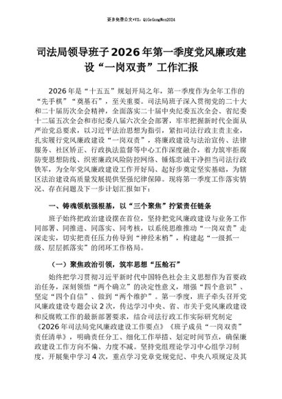 【七哥公文】2026年:司法局领导班子2026年第一季度党风廉政建设“一岗双责”工作汇报+更多免费公文+VX:QiGeGongWen2024