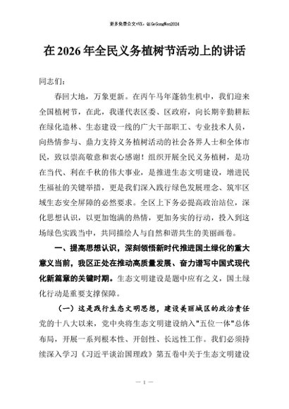 【七哥公文】2026年:在2026年全民义务植树节活动上的讲话+更多免费公文+VX:QiGeGongWen2024 - 七哥-AI智库