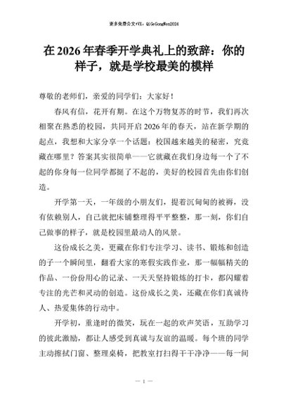 【七哥公文】2026年:在2026年春季开学典礼上的致辞:你的样子,就是学校最美的模样+更多免费公文+VX:QiGeGongWen2024 - 七哥-AI智库