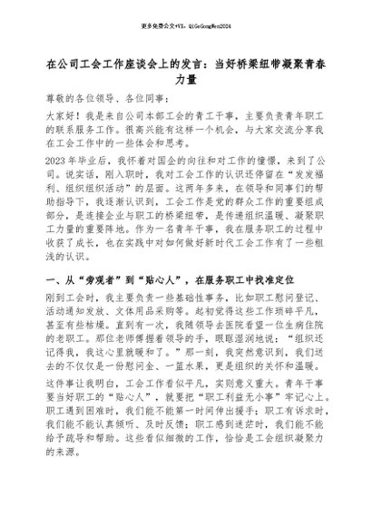 【七哥公文】2026年:在公司工会工作座谈会上的发言:当好桥梁纽带凝聚青春力量_副本+更多免费公文+VX:QiGeGongWen2024
