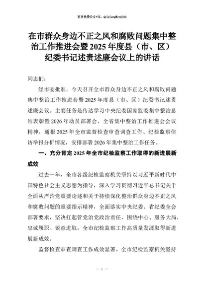 【七哥公文】2026年:在市群众身边不正之风和腐败问题集中整治工作推进会暨2025年度县(市、区)纪委书记述责述廉会议上的讲话+更多免费公文+VX:QiGeGongWen2024
