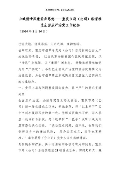 【七哥公文】2026年:山城扬清风廉韵声悠悠——重庆市局(公司)纵深推进全面从严治党工作纪实_副本+更多免费公文+VX:QiGeGongWen2024