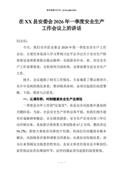 【七哥公文】2026年:在XX县安委会2026年一季度安全生产工作会议上的讲话+更多免费公文+VX:QiGeGongWen2024