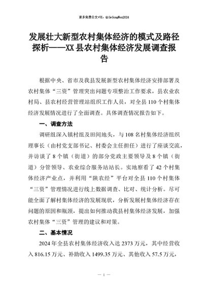 【七哥公文】2026年:发展壮大新型农村集体经济的模式及路径探析——XX县农村集体经济发展调查报告+更多免费公文+VX:QiGeGongWen2024