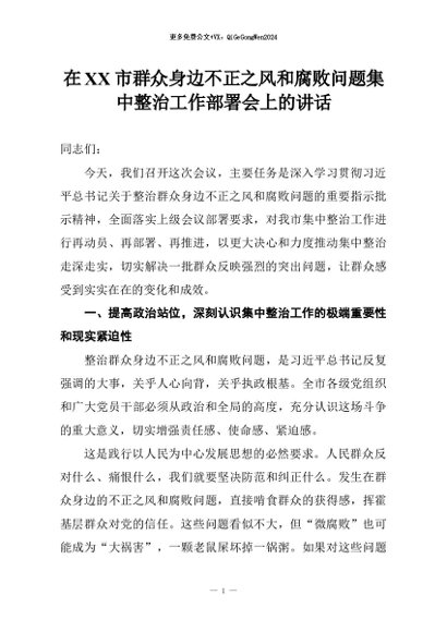 【七哥公文】2026年:在XX市群众身边不正之风和腐败问题集中整治工作部署会上的讲话+更多免费公文+VX:QiGeGongWen2024