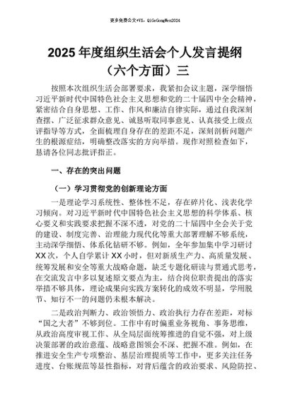 【七哥公文】2026年:2025年度组织生活会个人发言提纲(六个方面)三+更多免费公文+VX:QiGeGongWen2024 - 七哥-AI智库