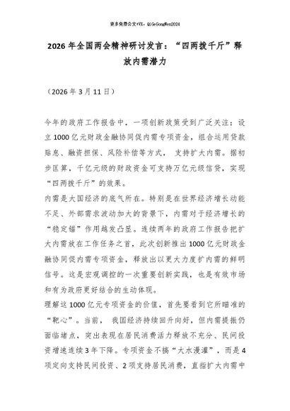 【七哥公文】2026年:2026年全国两会精神研讨发言:“四两拨千斤”释放内需潜力_副本+更多免费公文+VX:QiGeGongWen2024