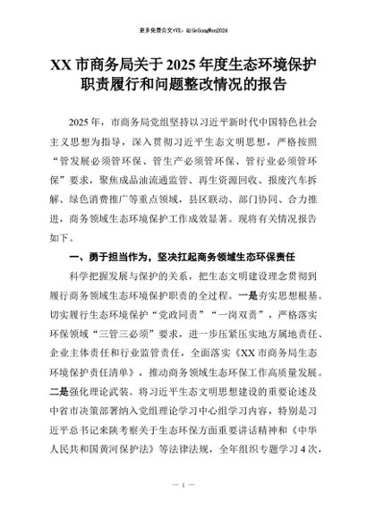 【七哥公文】2026年:XX市商务局关于2025年度生态环境保护职责履行和问题整改情况的报告+更多免费公文+VX:QiGeGongWen2024 - 七哥-AI智库