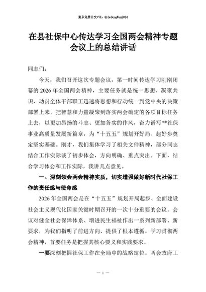 【七哥公文】2026年:在县社保中心传达学习全国两会精神专题会议上的总结讲话+更多免费公文+VX:QiGeGongWen2024