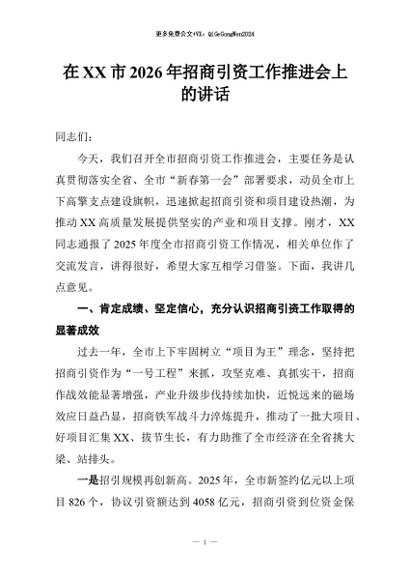 / 【七哥公文】2026年:在XX市2026年招商引资工作推进会上的讲话+更多免费公文+VX:QiGeGongWen2024