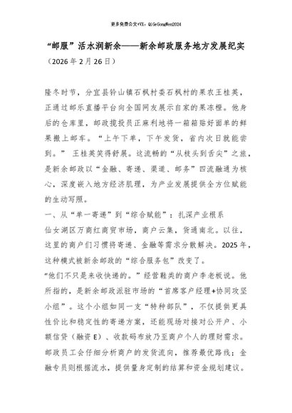 / 【七哥公文】2026年:“邮服”活水润新余——新余邮政服务地方发展纪实+更多免费公文+VX:QiGeGongWen2024