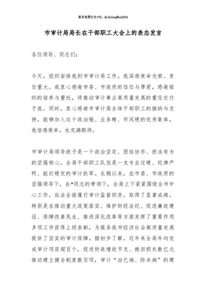 【七哥公文】2026年:市审计局局长在干部职工大会上的表态发言_副本+更多免费公文+VX:QiGeGongWen2024