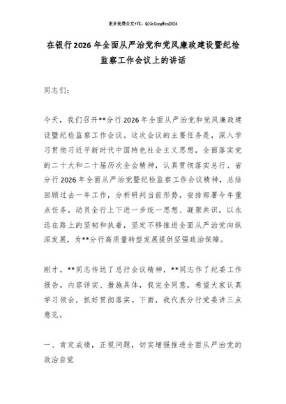 【七哥公文】2026年:在银行2026年全面从严治党和党风廉政建设暨纪检监察工作会议上的讲话_副本+更多免费公文+VX:QiGeGongWen2024