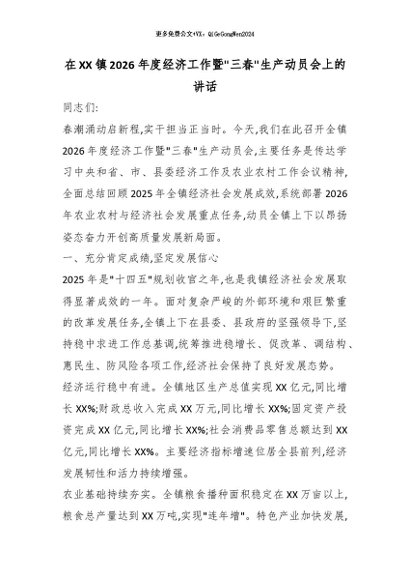 【七哥公文】2026年:在XX镇2026年度经济工作暨“三春”生产动员会上的讲话_副本+更多免费公文+VX:QiGeGongWen2024