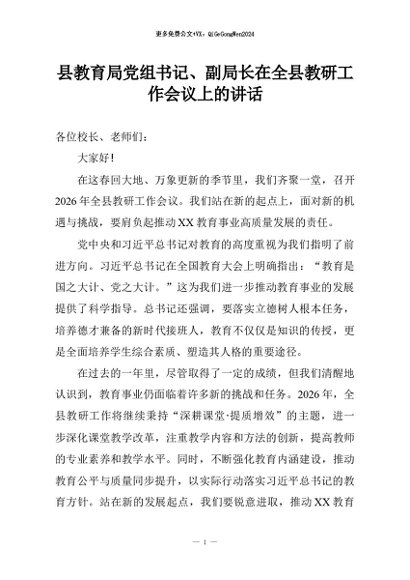 【七哥公文】2026年:县教育局党组书记、副局长在全县教研工作会议上的讲话+更多免费公文+VX:QiGeGongWen2024