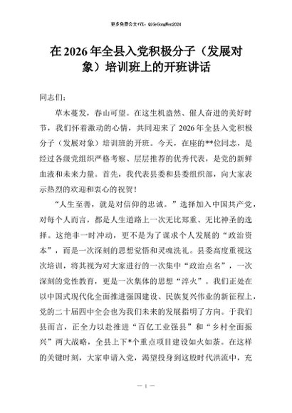 【七哥公文】2026年:在2026年全县入党积极分子(发展对象)培训班上的开班讲话+更多免费公文+VX:QiGeGongWen2024