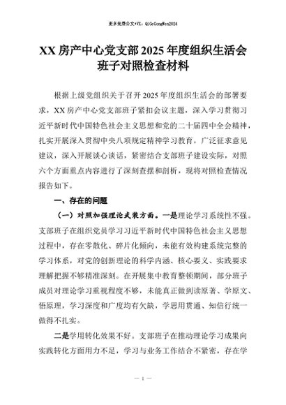 【七哥公文】2026年:XX房产中心党支部2025年度组织生活会班子对照检查材料+更多免费公文+VX:QiGeGongWen2024