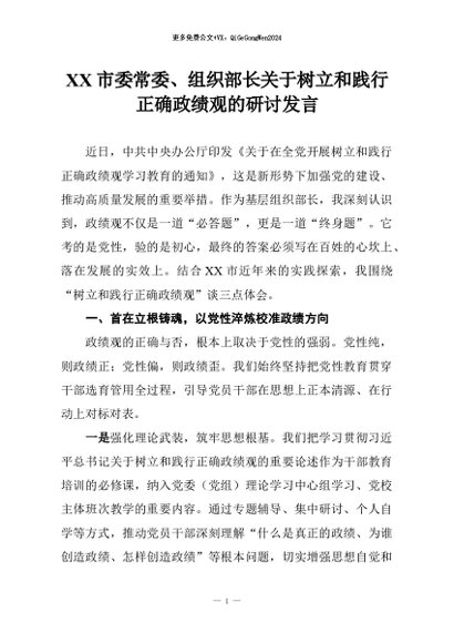 【七哥公文】2026年:XX市委常委、组织部长关于树立和践行正确政绩观的研讨发言+更多免费公文+VX:QiGeGongWen2024