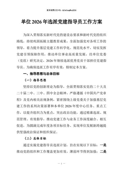 / 【七哥公文】2026年:单位2026年选派党建指导员工作方案+更多免费公文+VX:QiGeGongWen2024