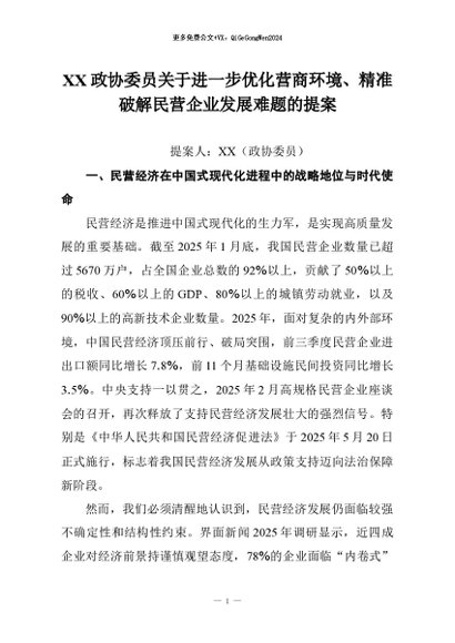 【七哥公文】2026年:XX政协委员关于进一步优化营商环境、精准破解民营企业发展难题的提案+更多免费公文+VX:QiGeGongWen2024