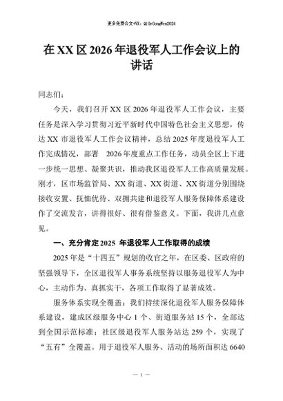 / 【七哥公文】2026年:在XX区2026年退役军人工作会议上的讲话+更多免费公文+VX:QiGeGongWen2024