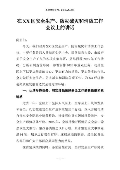 【七哥公文】2026年:在XX区安全生产、防灾减灾和消防工作会议上的讲话+更多免费公文+VX:QiGeGongWen2024