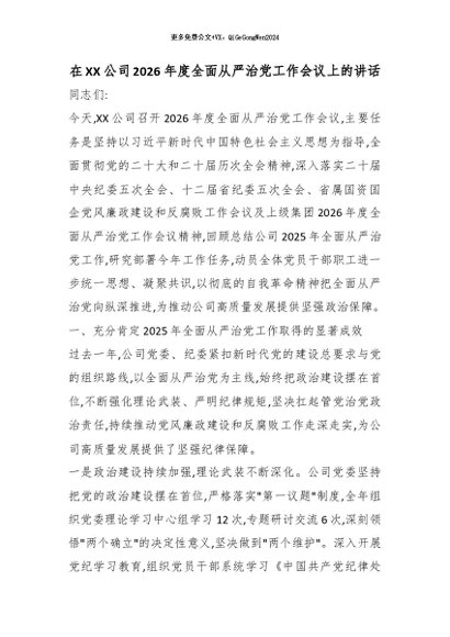 【七哥公文】2026年:在XX公司2026年度全面从严治党工作会议上的讲话_副本+更多免费公文+VX:QiGeGongWen2024