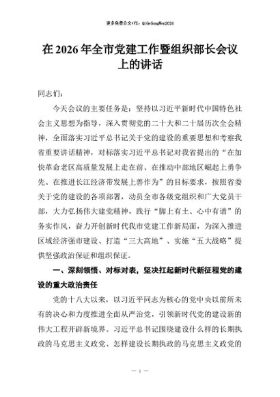 / 【七哥公文】2026年:在2026年全市党建工作暨组织部长会议上的讲话+更多免费公文+VX:QiGeGongWen2024